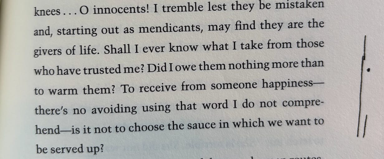 Man, Colette has a discomfort with happiness! I guess I could have written that above, of the woman who knows her daily hour of abyss. But Colette accepts happiness when it comes with the specificity of a person delivering it (the particular sauce). And I’m charmed by a discomfort with happiness, until the specific flavor of the happiness just overwhelms. Happiness from a tangy green chili sauce is not the same as a syrupy barbecue. Sauce is my toddler’s current primary demand for his meals, and mostly he means pesto, especially when he says hot sauce. But his first sauce, very French: a lemony roux, on a trout. A sauce, in which, I’d choose to be served up.